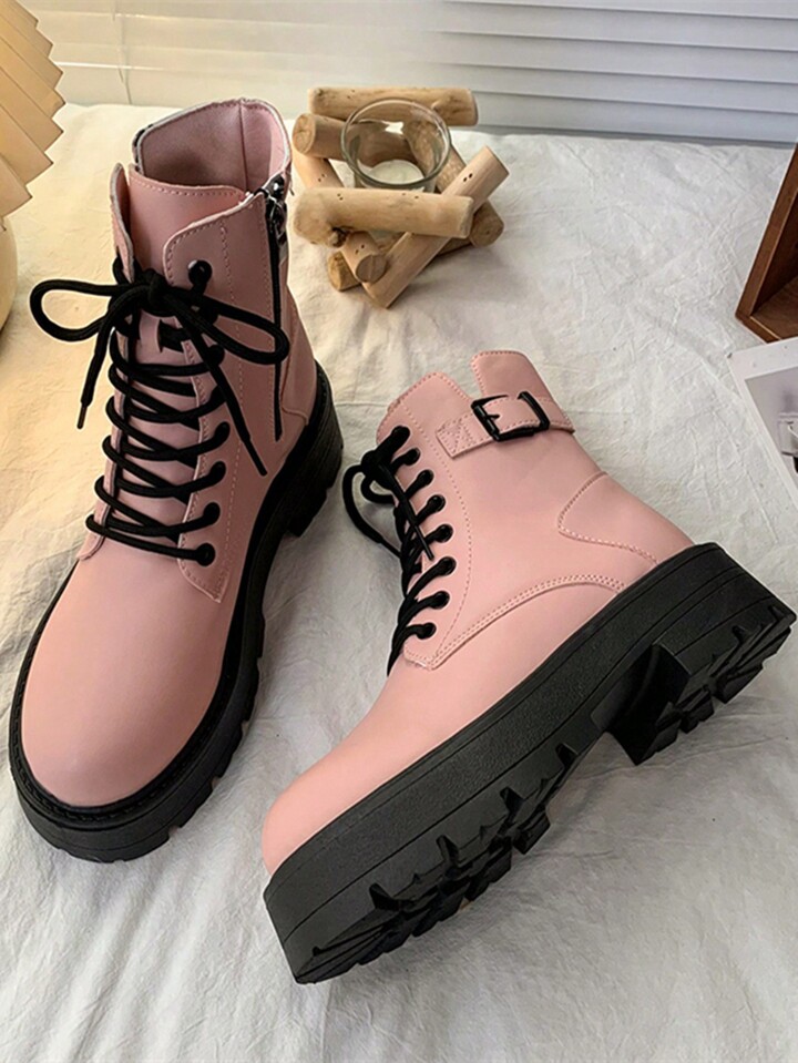 Kawaii Women Buckle Decor Lace-up Front Combat Boots, Fashion Outdoor Boots