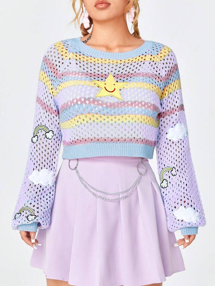 Kawaii Women Colorful Striped Pentagram Hollow Out Drop Shoulder Long Sleeve Sweater