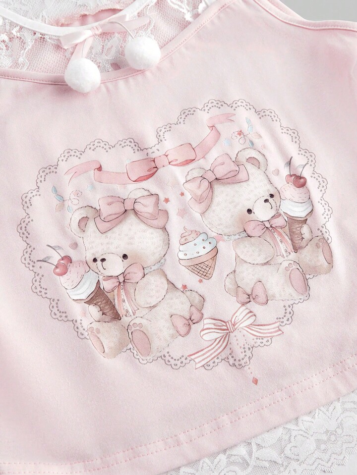 Kawaii Women Cute 2 In 1s Lace Patchwork Fuzzy Bow & Bear Graphic Print Camisole