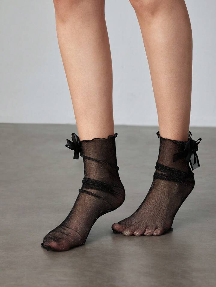 Kawaii Women Mid-Calf Socks With Bow Decor & Glittering Details