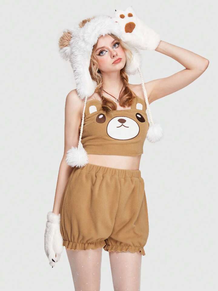 Kawaii Women'S Cute Bear Embroidery Shorts 2pcs/Set