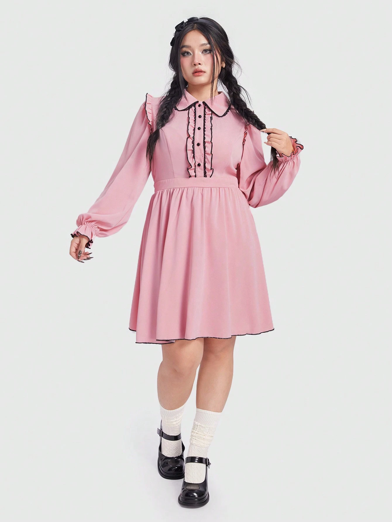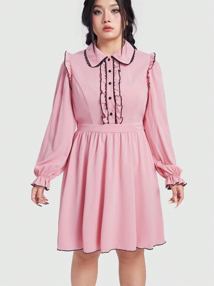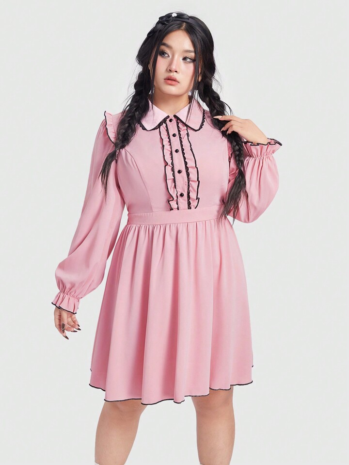 Kawaii Women'S Plus Size Colorblock Frill Trim Pleated Waist Dress With Frill Hem