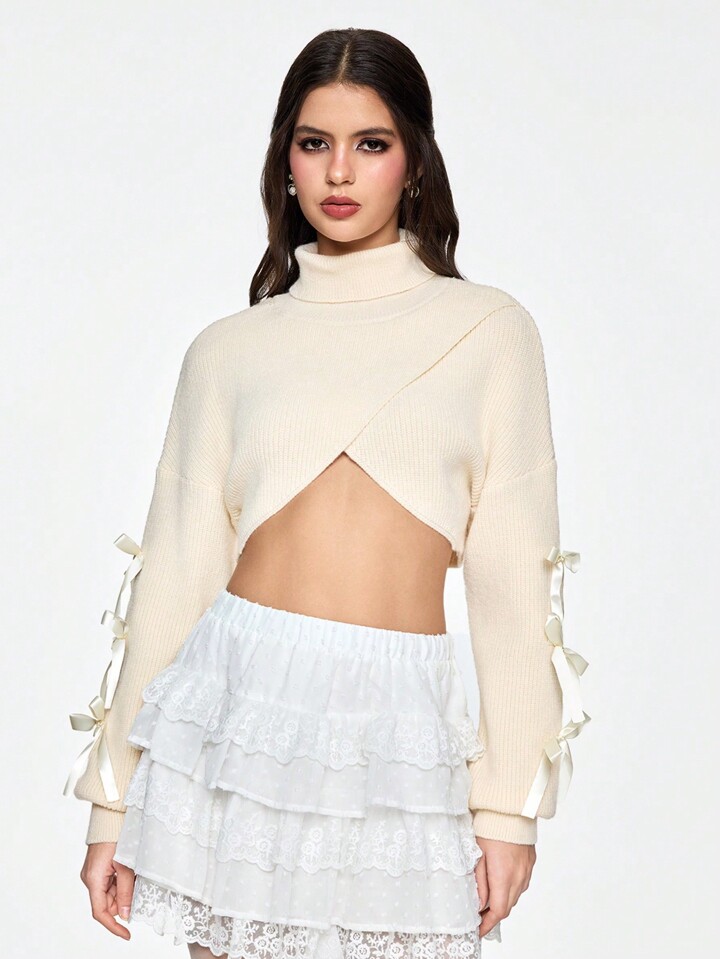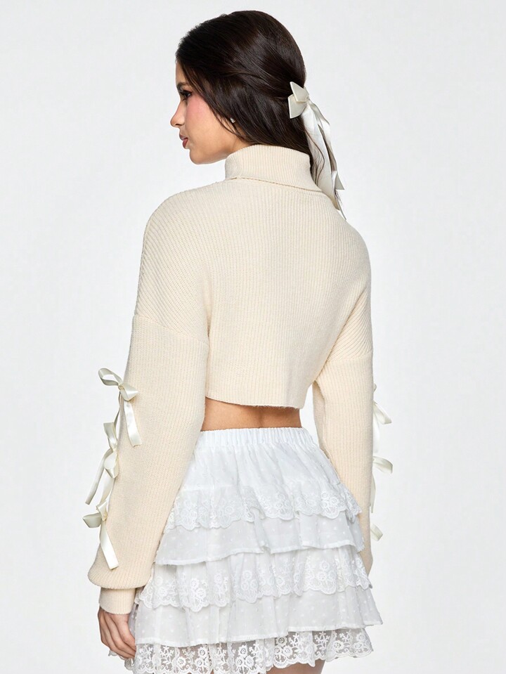 Kawaii Women Simple Crewneck Asymmetrical Hem Ribbon Bow Knit Sweater, Versatile All-Match Design