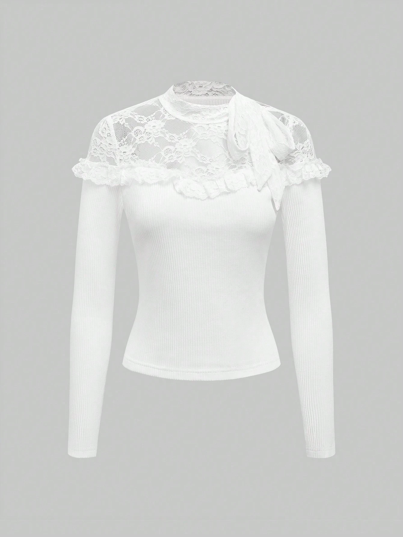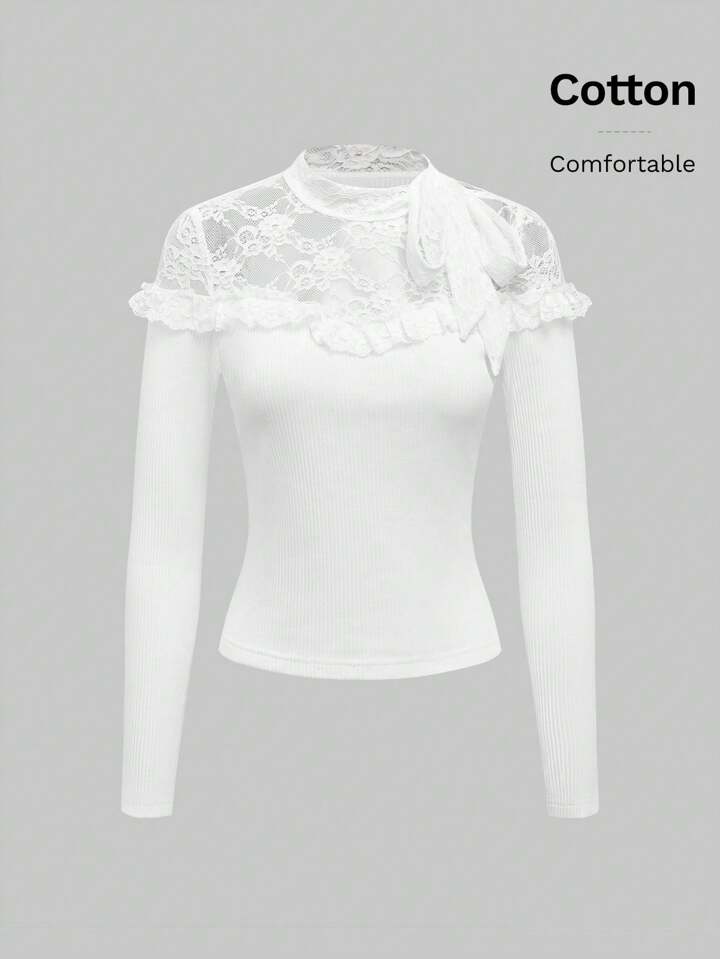 Kawaii Women Solid Color Lace Patchwork Long Sleeve Casual Blouse, Everyday Wear