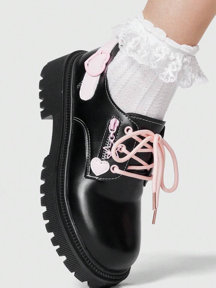 Kawaii Women's 5cm Thick Sole Round Toe Retro English Style Fashion Daily Casual Increased Height Slimming Shoes, Pink Heart Buckle Star Zipper Decor, PU Lace-Up Flats Suitable For Valentine's Day Spring Shoes