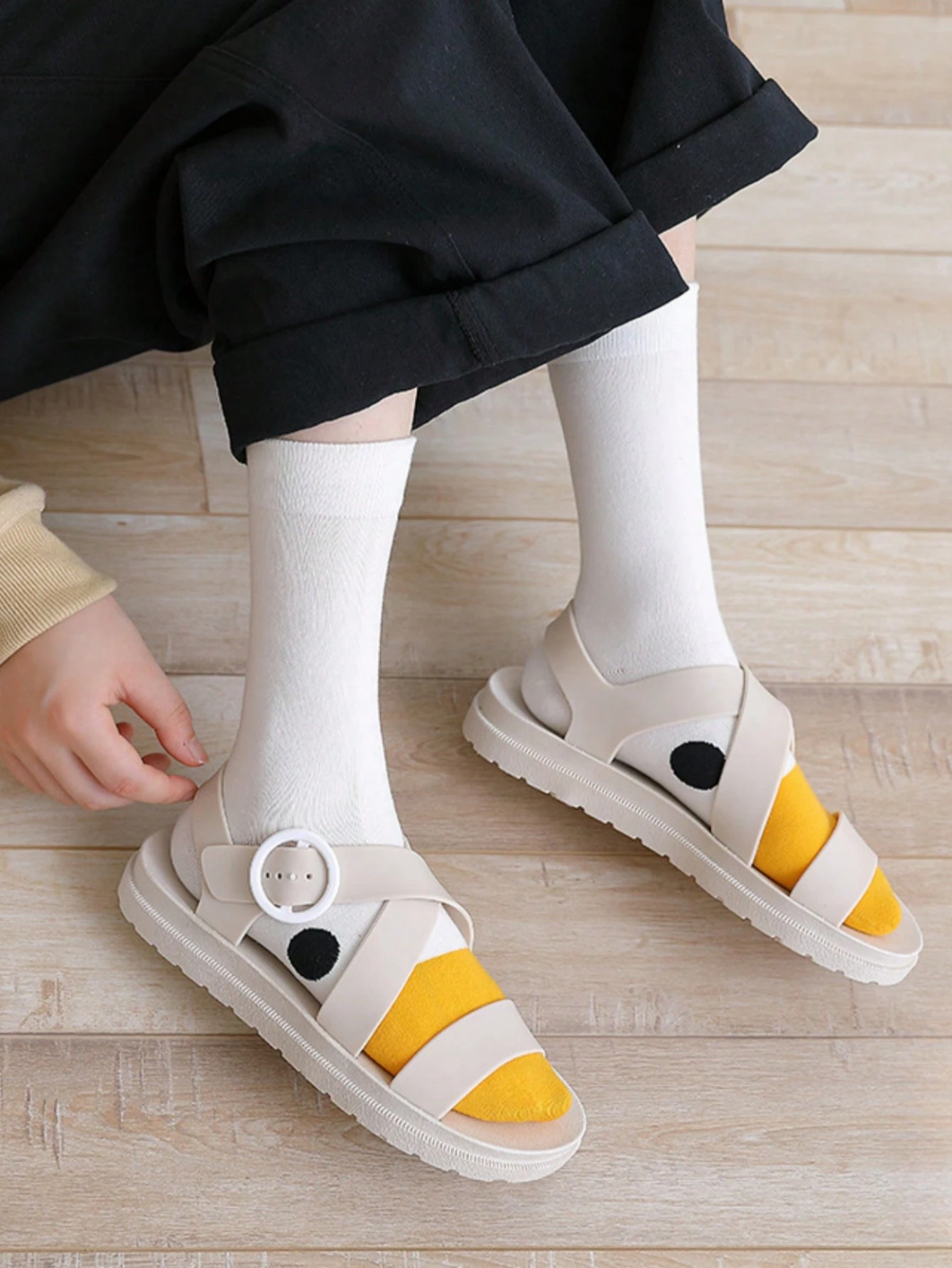 Kawaii Women's Black Polka Dot Decor Yellow & White Patchwork Mid-calf Socks