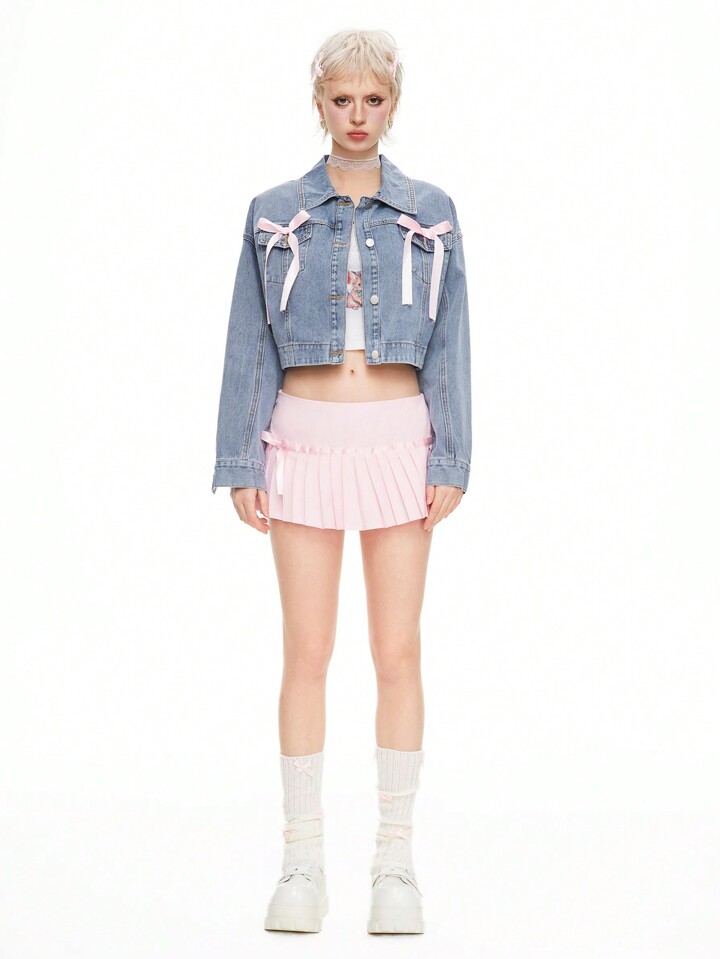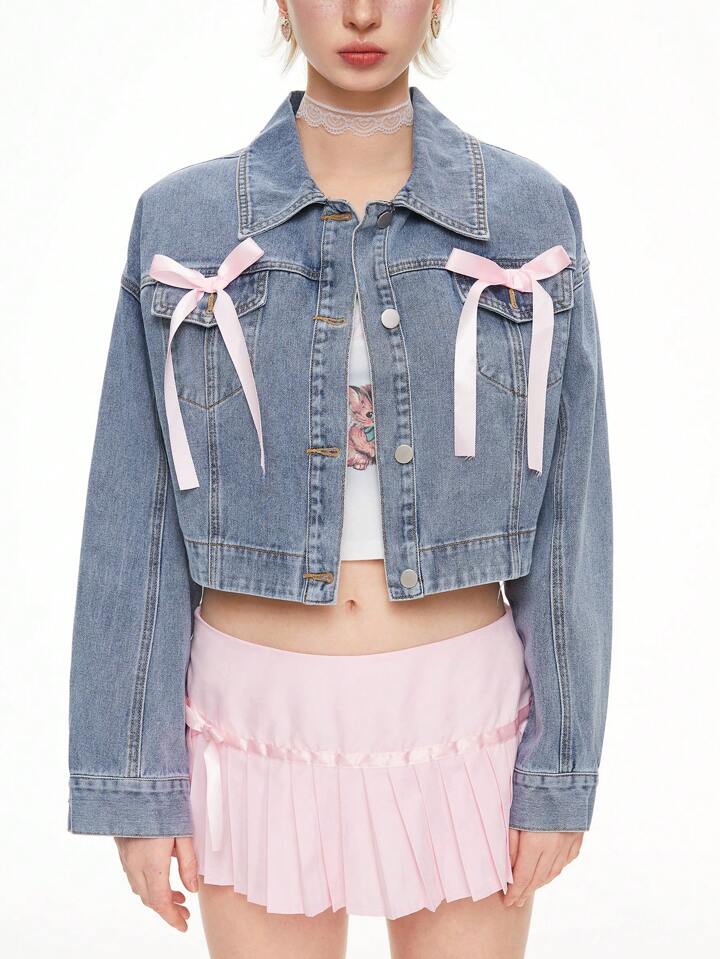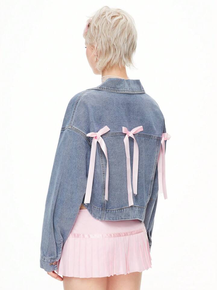 Kawaii Women's Casual Denim Jacket With Bowknot Decor, Dropped Shoulder, Long Sleeve, Spring & Autumn, School