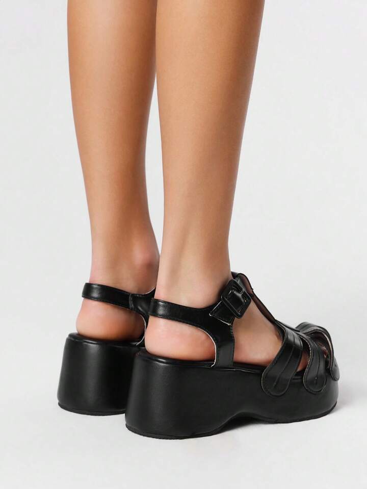 Kawaii Women's Dark Mary Jane Small Leather Shoes, Hollow Woven Mule Shoes, Floral Closed Toe Platform & Wedge Sandals