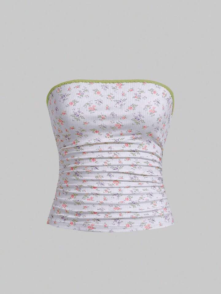 Kawaii Women's Ditsy Floral Ruched Tube Top For Vacation