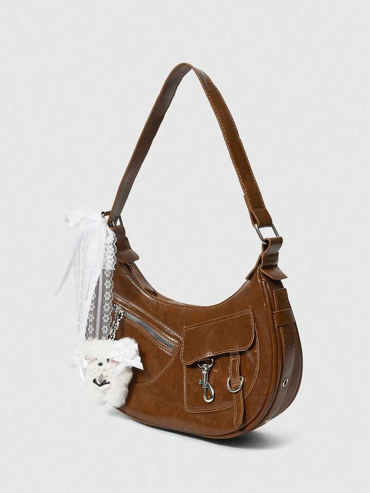 Kawaii Women's Fashion Daily Commute Doll Brown Button Motorcycle Bag