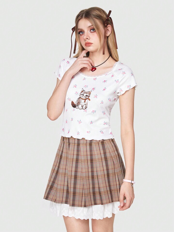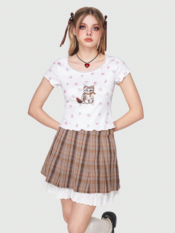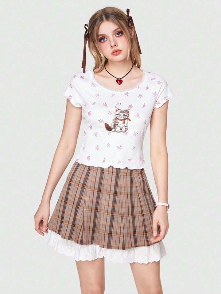 Kawaii Women's Lace Trimmed Cat Print T-shirt