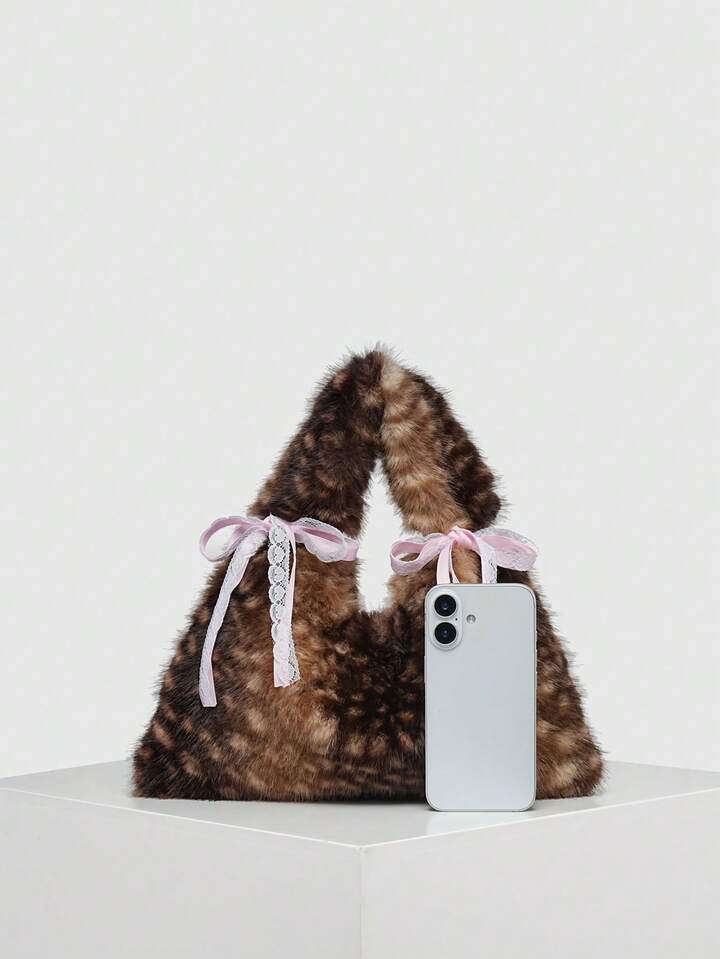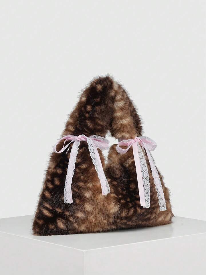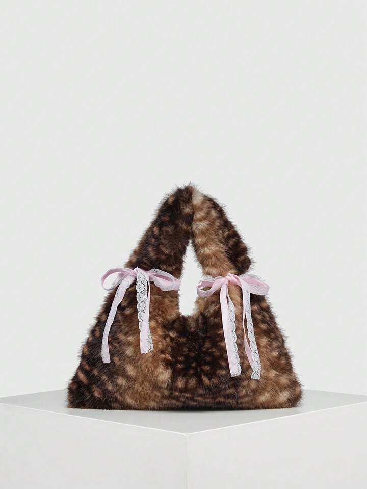 Kawaii Women's Leopard And Deer Print Y2K Retro Fashion Artificial Fur Long Hair Open Top Large Capacity Thickened Autumn/Winter Shoulder Crossbody Crescent Bag