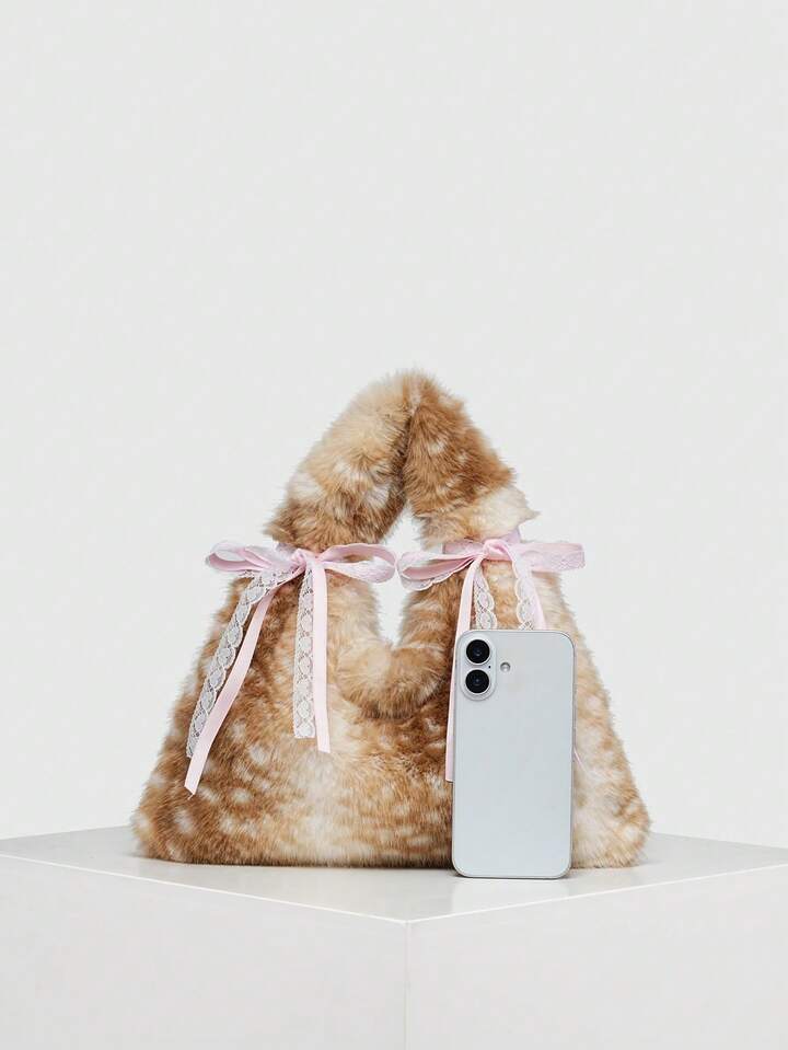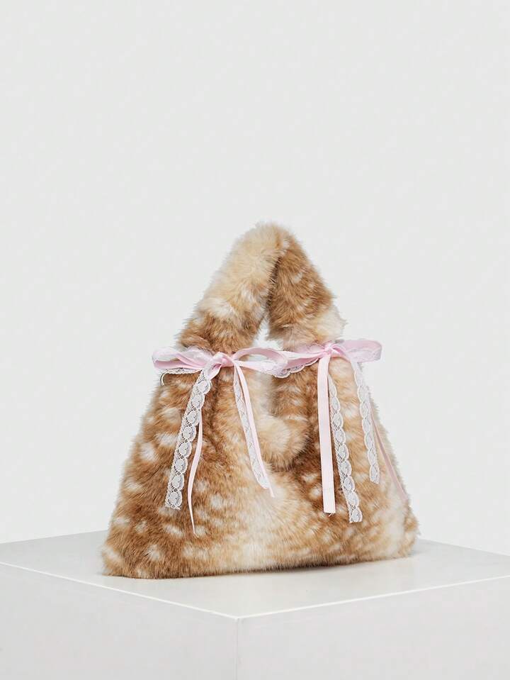 Kawaii Women's Leopard And Deer Print Y2K Retro Fashion Artificial Fur Long Hair Open Top Large Capacity Thickened Autumn/Winter Shoulder Crossbody Crescent Bag