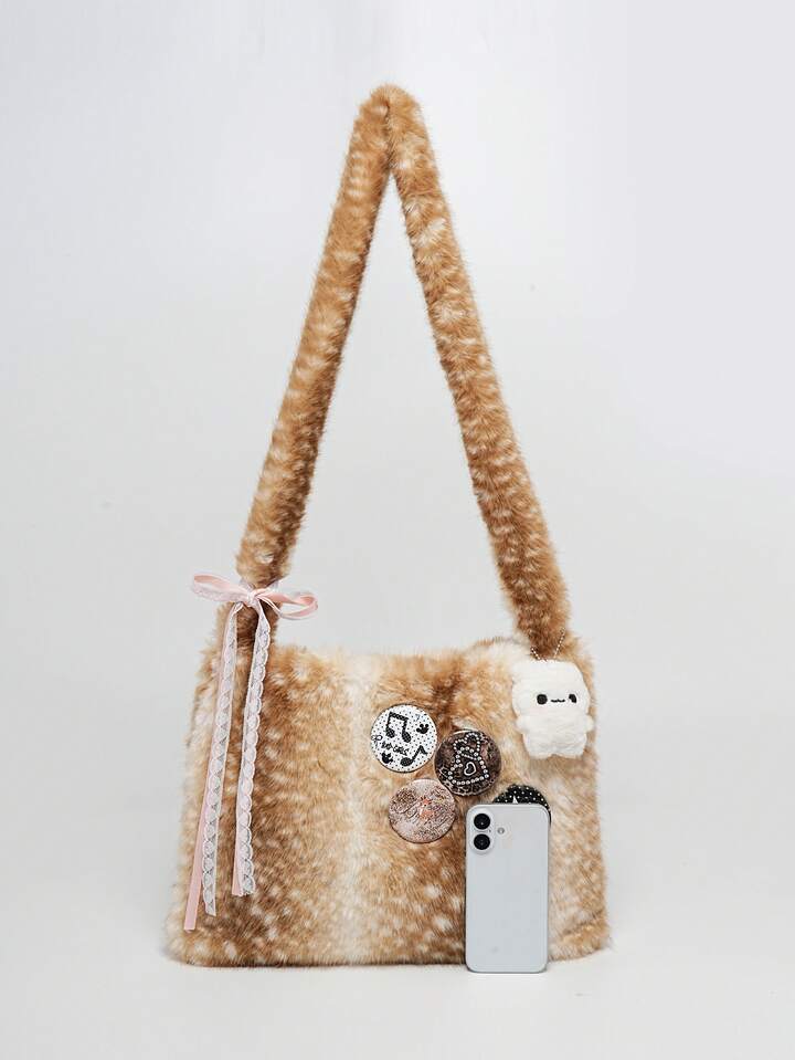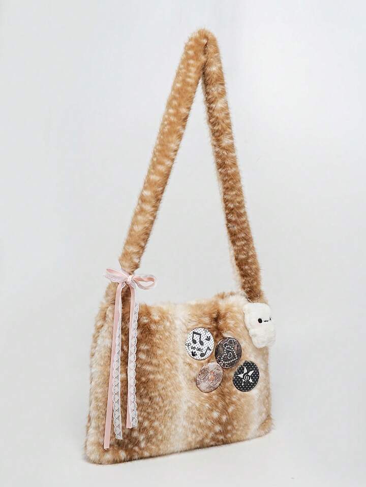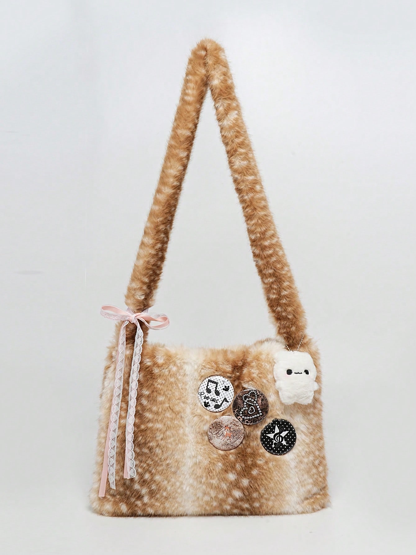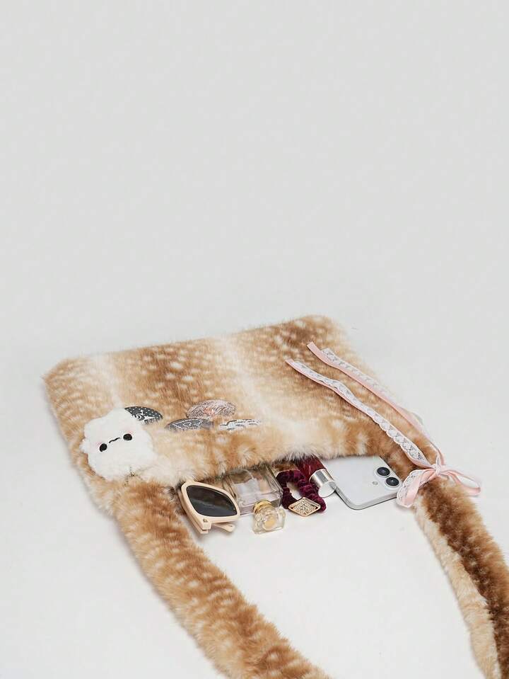 Kawaii Women's Leopard And Deer Print Y2K Retro Fashion Artificial Fur Long Hair Open Top Large Capacity Thickened Autumn/Winter Shoulder Crossbody Crescent Bag