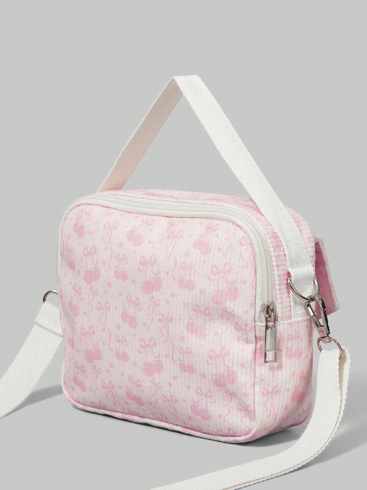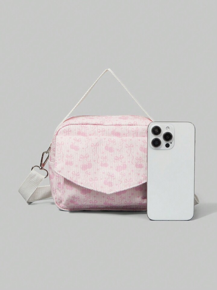 Kawaii Women's Pink Corduroy Crossbody Bag – Bow & Cherry Print Multi-Functional Purse For Crossbody/Shoulder Carry