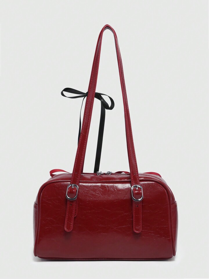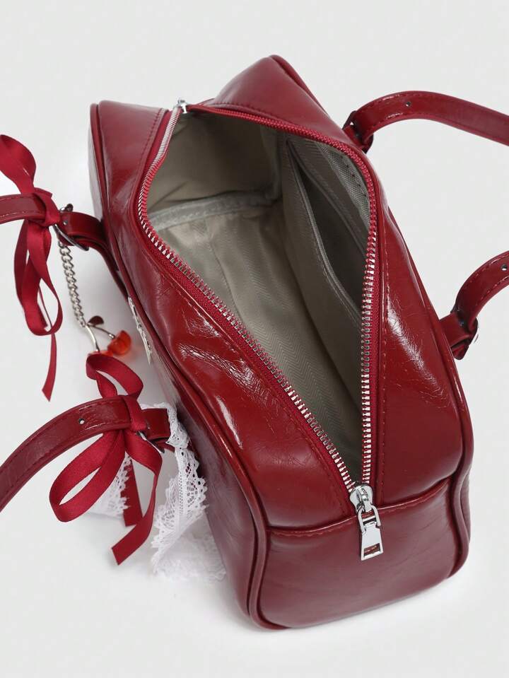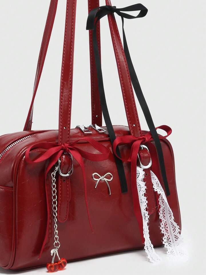 Kawaii Women's Retro Cute Plaid Bow-Tie Decor Cherry Heart Shoulder Underarm Tote Bag With Multiple Pockets, Fashionable Burgundy Bag