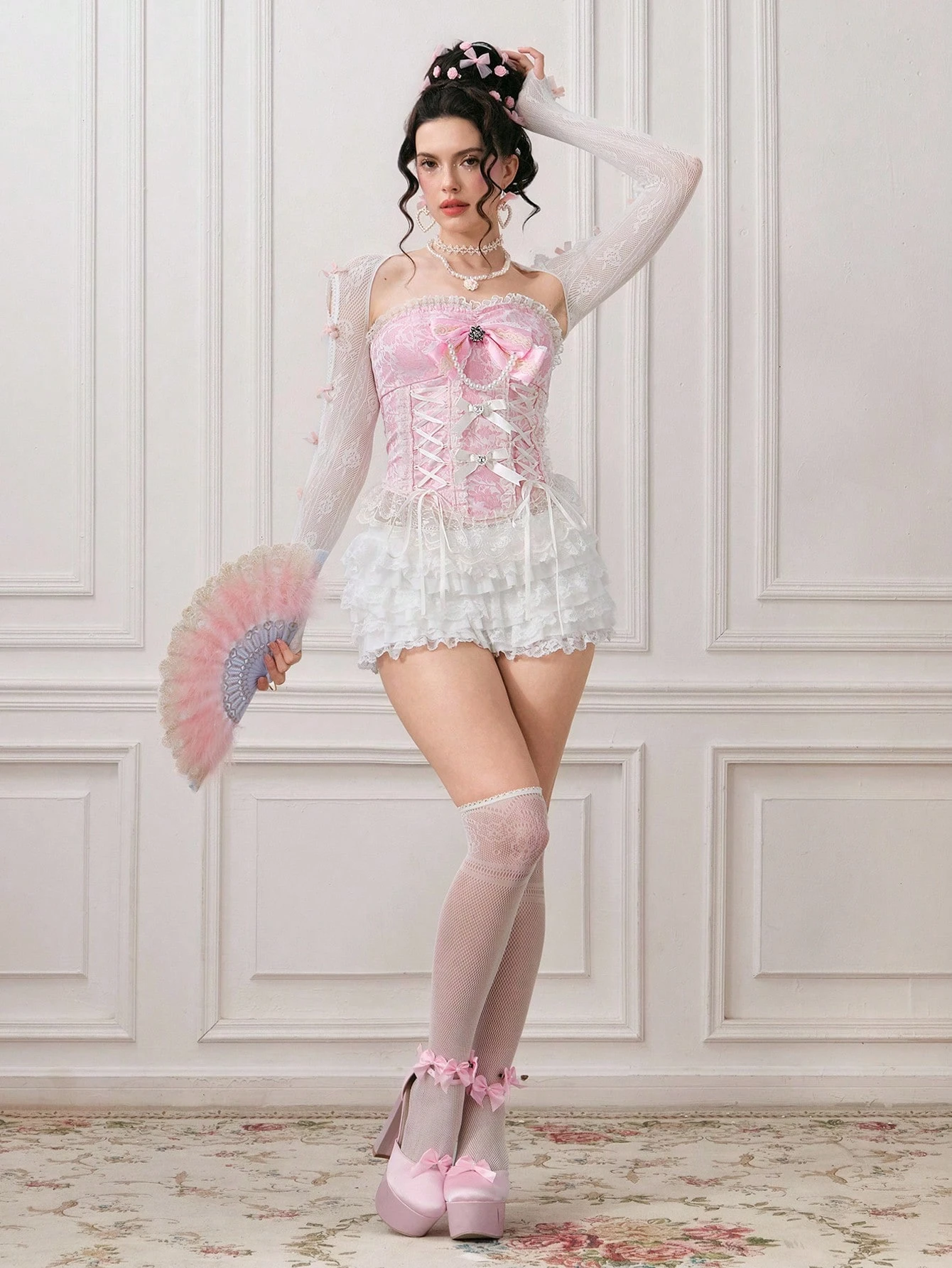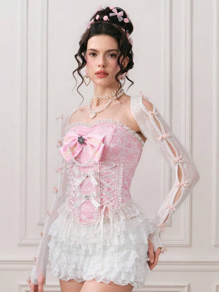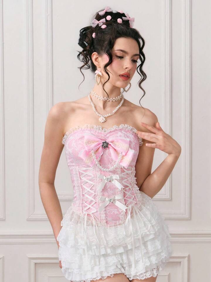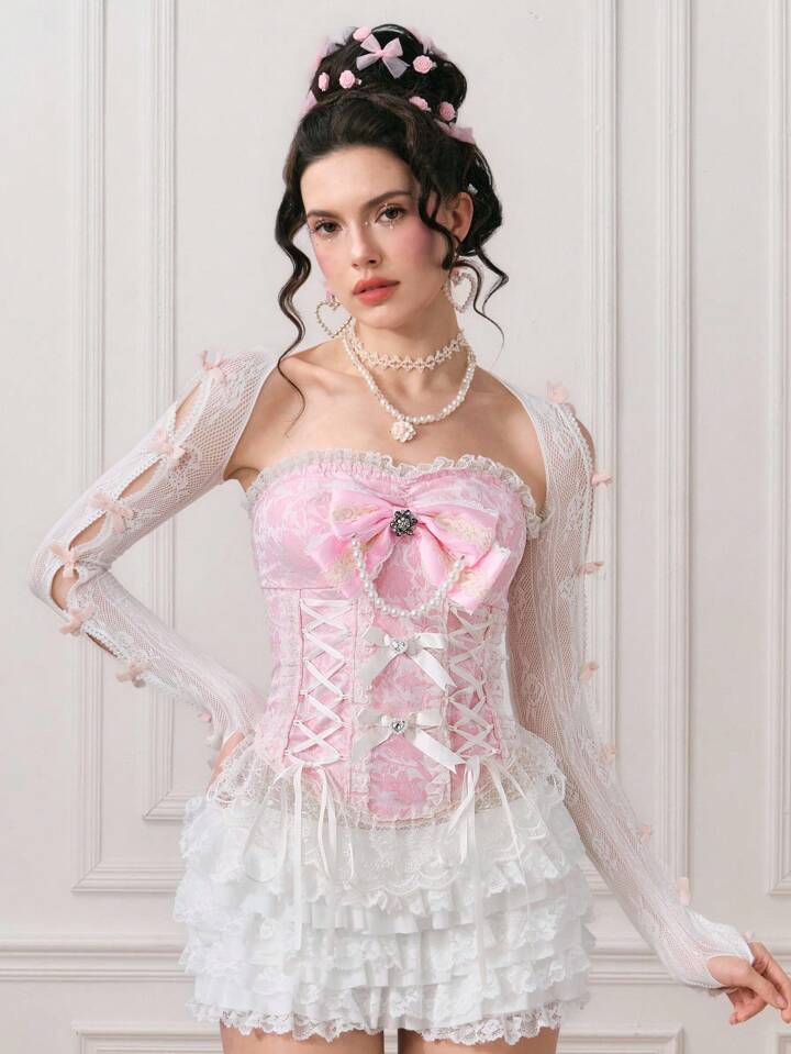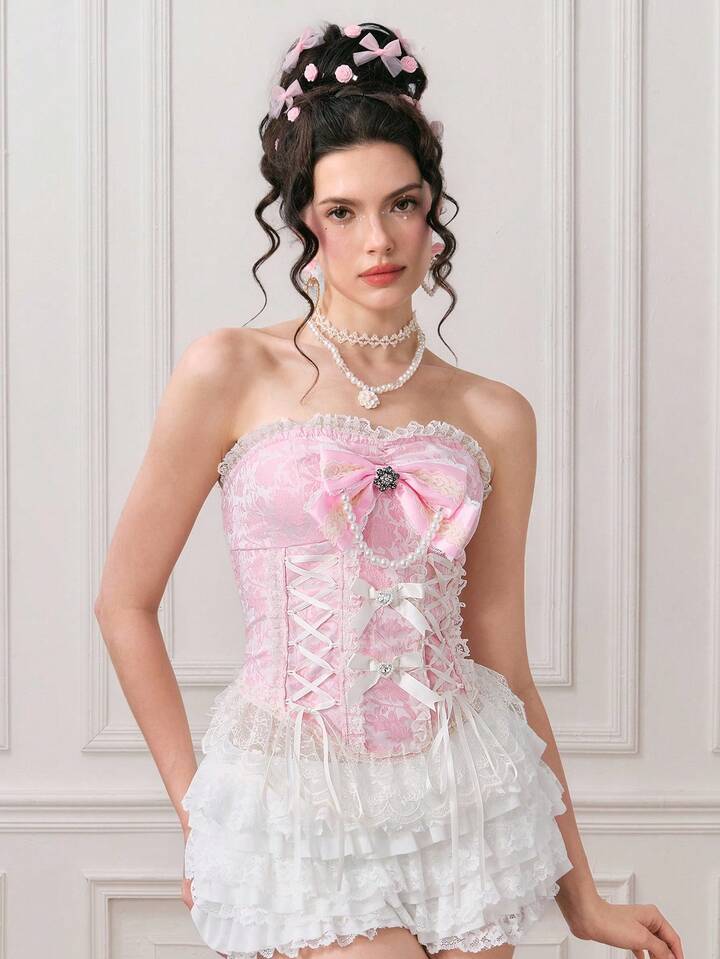Kawaii Women's Retro Vintage Palace Style Romantic Pearl Bow Ribbon Tied Bustier Top