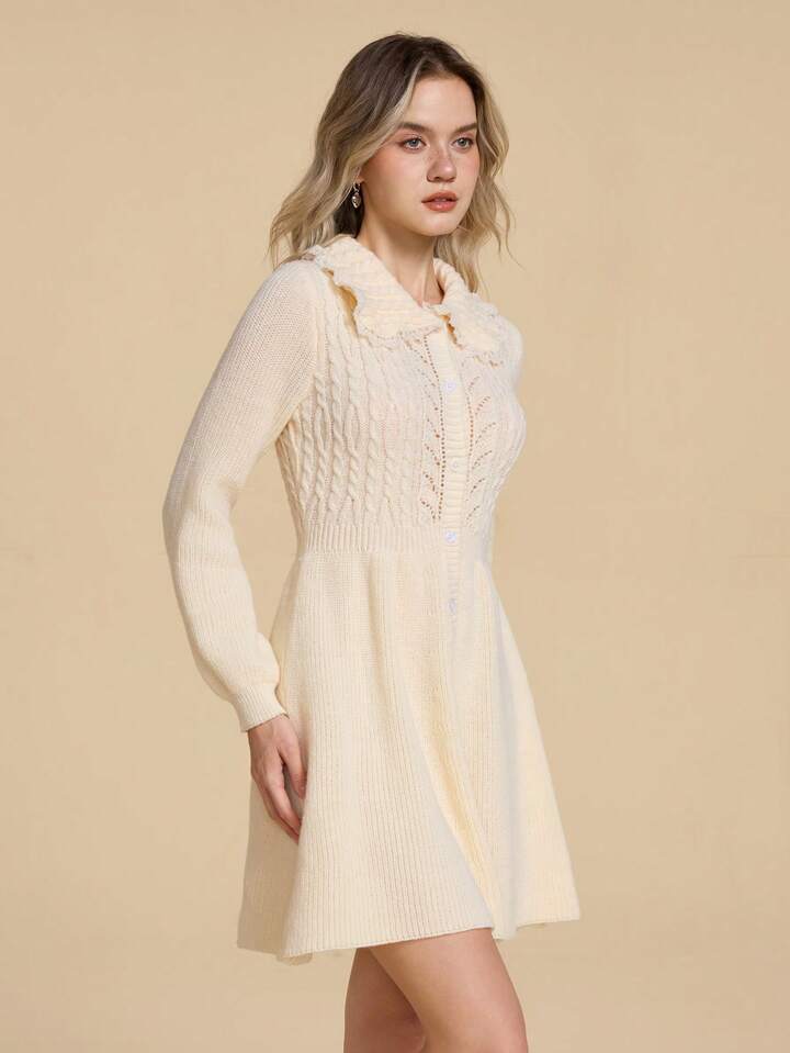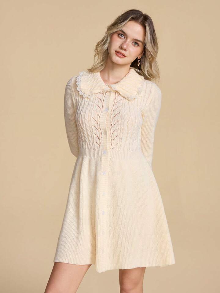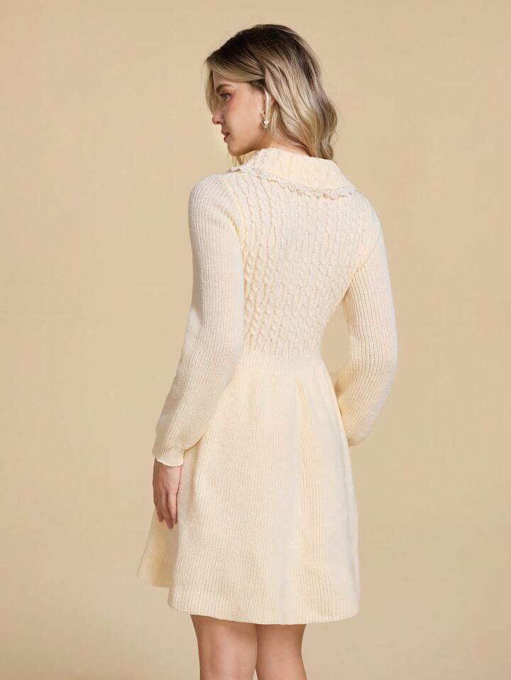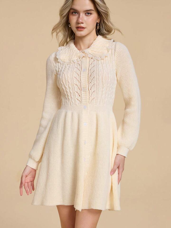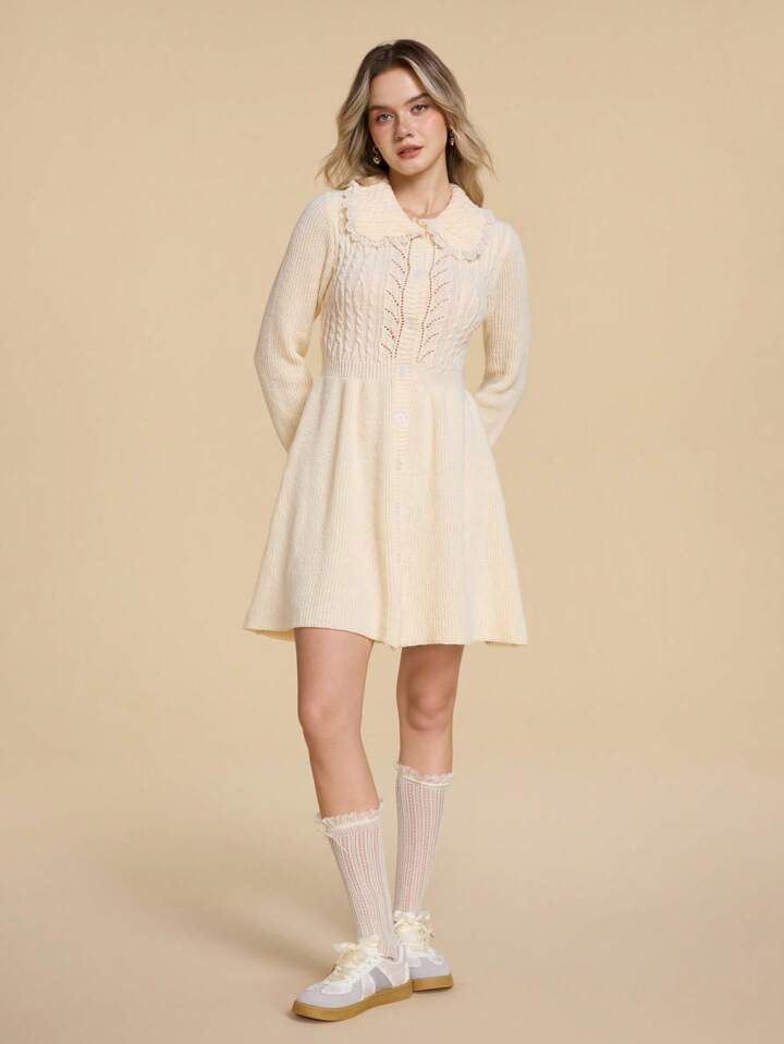 Kawaii Women's Sexy Cute Peter Pan Collar Lace Trim Waist Cinched Knitting Dress