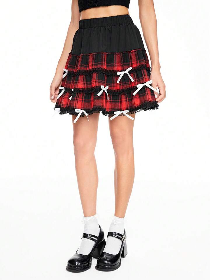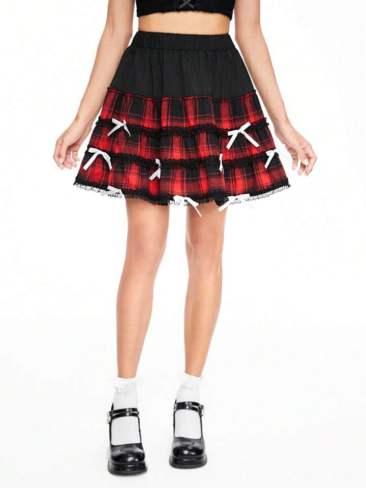 Kawaii Women's Sweet Plaid Contrast Lace Trim Bow Decor Mini Skirt, Summer