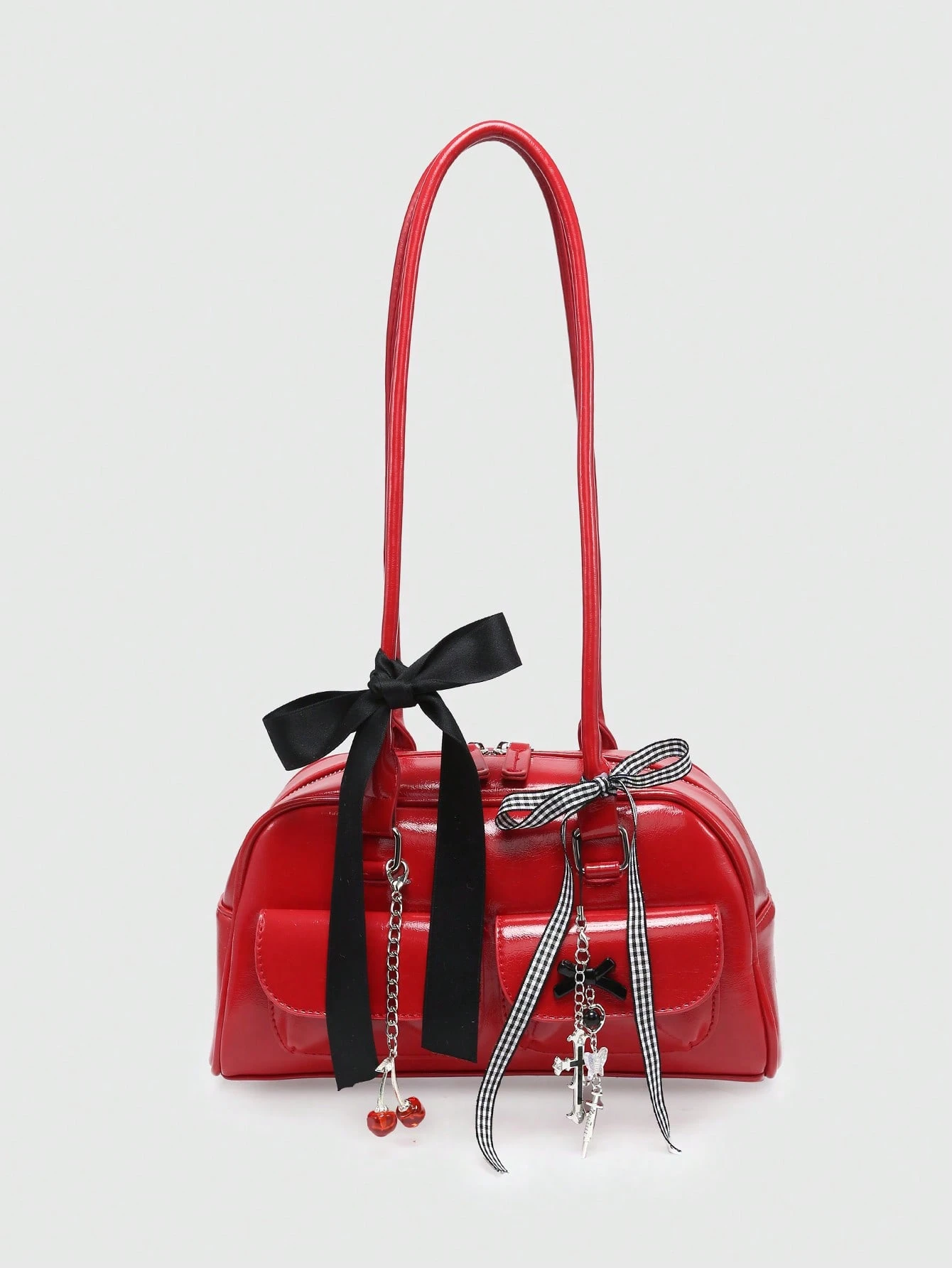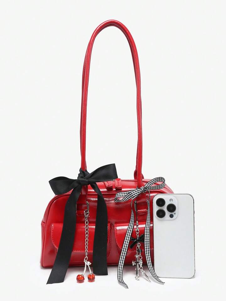 Kawaii Women's Vintage Checkered Bowknot Decoration Cherry Heart Shoulder Underarm Bag With Multiple Pockets, Boston Style