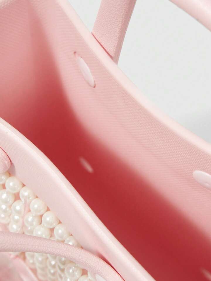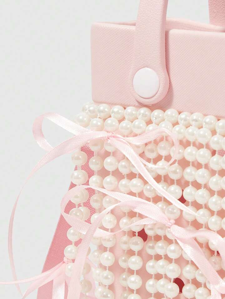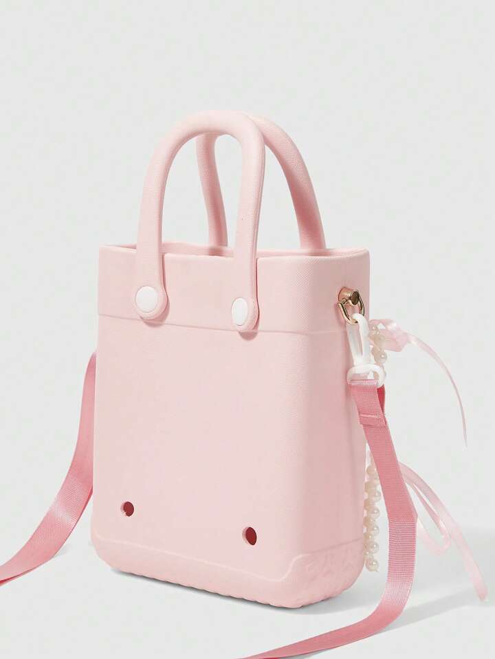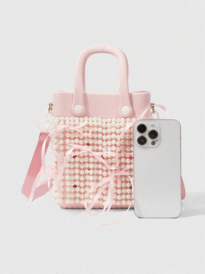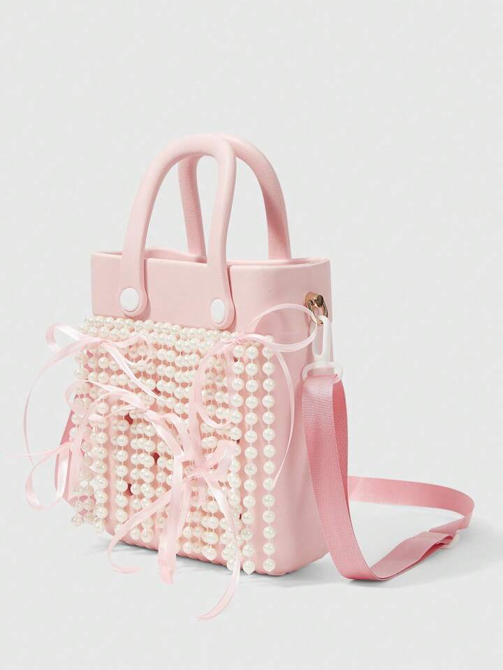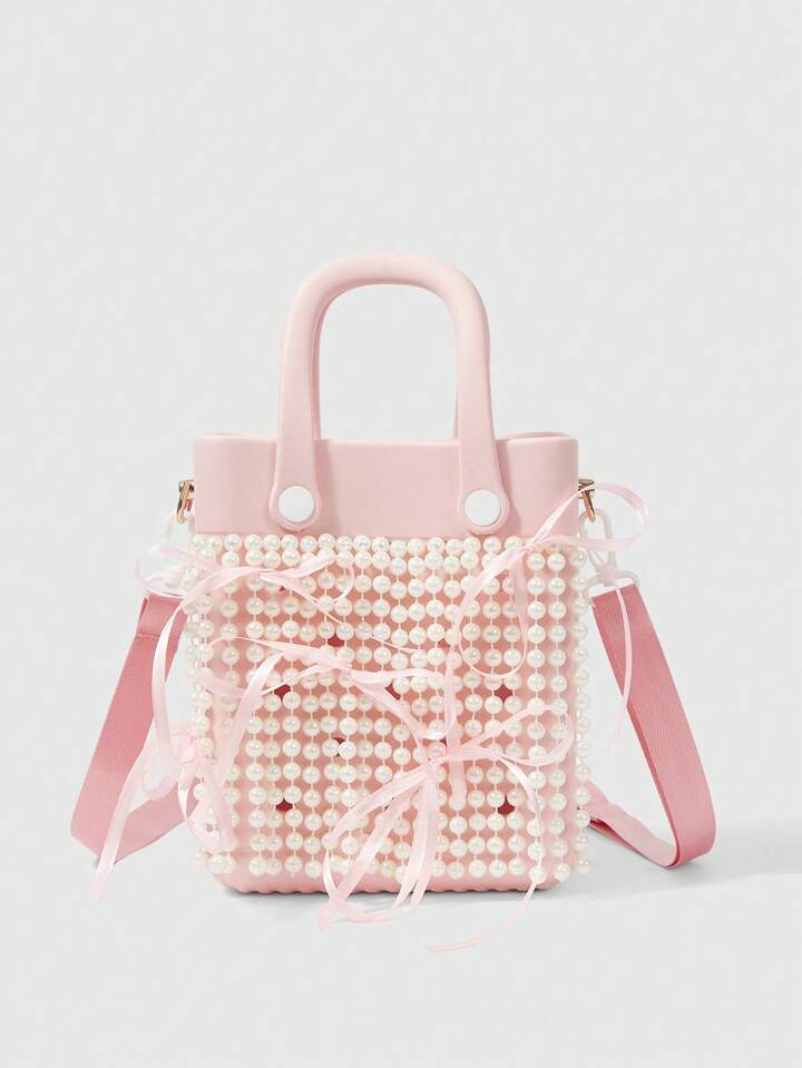 Kawaii Women's Waterproof EVA Faux Pearl Chain Handbag Women's Pink Ribbon Bow Accent Beach-To-Street Tote, Stylish Seaside Vacation & Daily Use Handbag Purse For Ladies