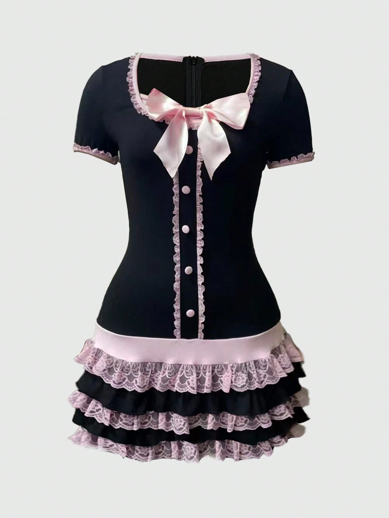 Kawaii Y2K Harajuku Style Princess Bow Decor Cake Skirt Mini Dress, Women Summer Outfits