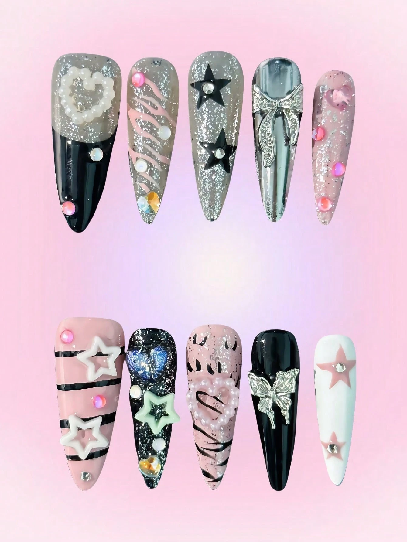 Kawaii Y2K Punk Striped 3D Star Sweet French Romantic Bowknot Heart-Shaped Butterfly Handmade False Nails, Dopamine Metallic Fashion For Music Festivals, Daily Travel, Shopping