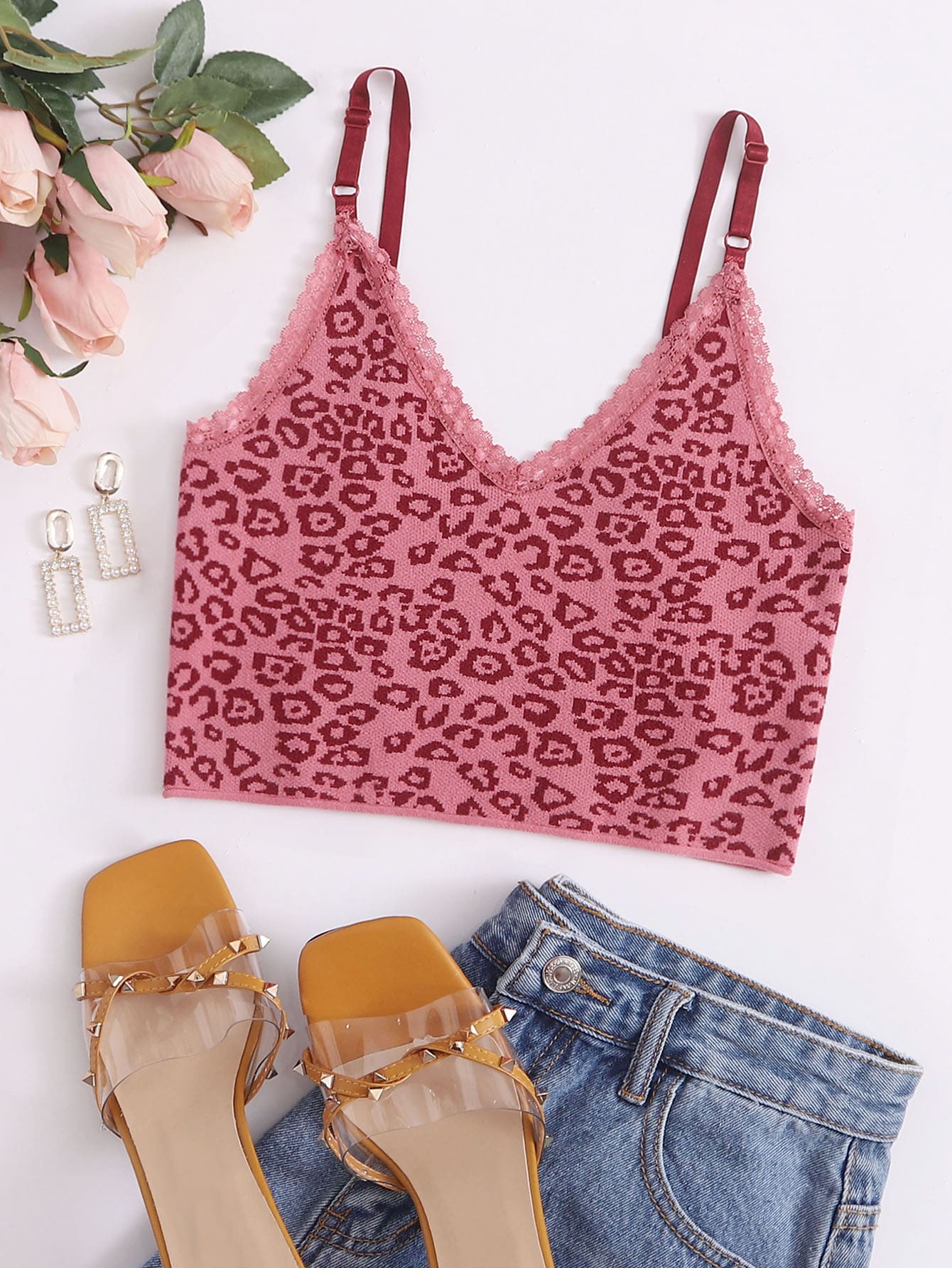 Lace Trim Leopard Knit Cami Top