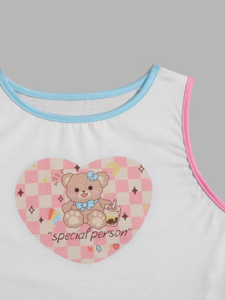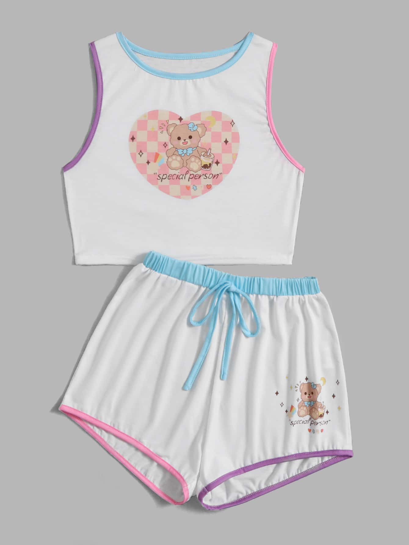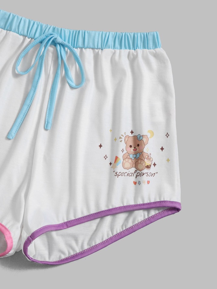 Letter Cartoon Bear Graphic Contrast Binding Bow Pajama Set