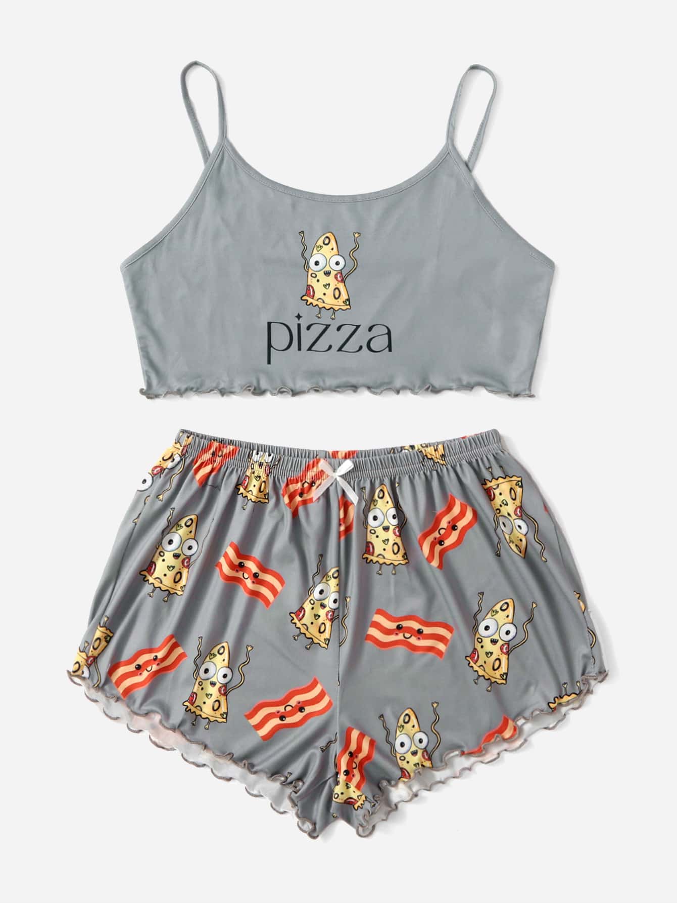 Letter & Cartoon Graphic Lettuce Trim Cami PJ Set