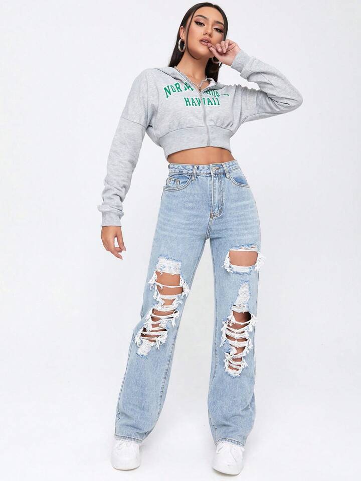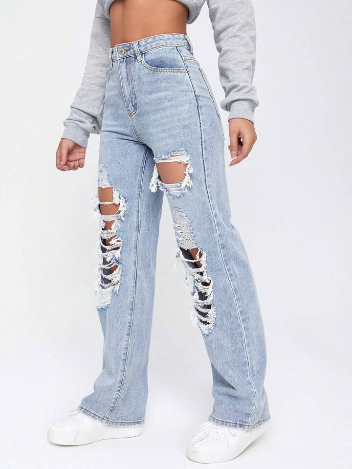 Light Washed Cut Out Ripped Straight Leg Jeans