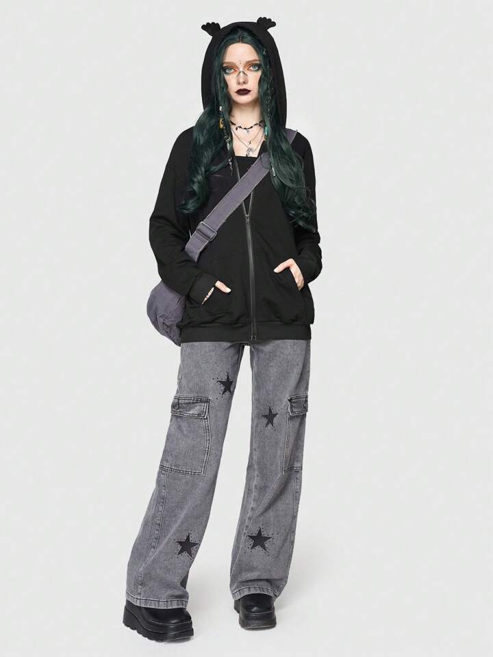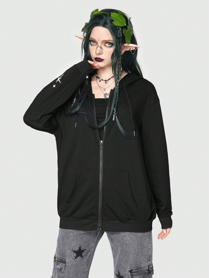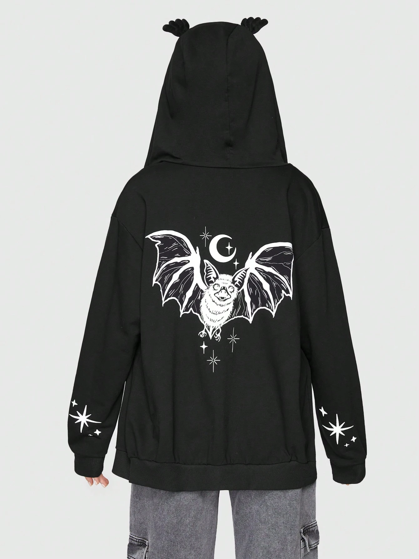 Mariexvx Bat & Moon Print Drop Shoulder Hoodie