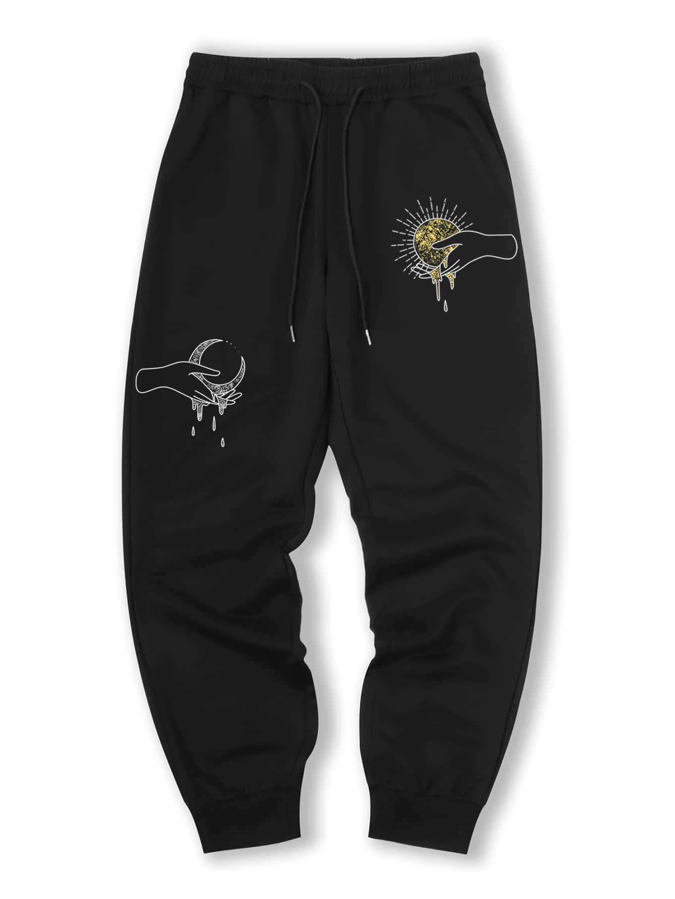 Men Hand Sun And Moon Print Drawstring Sweatpants