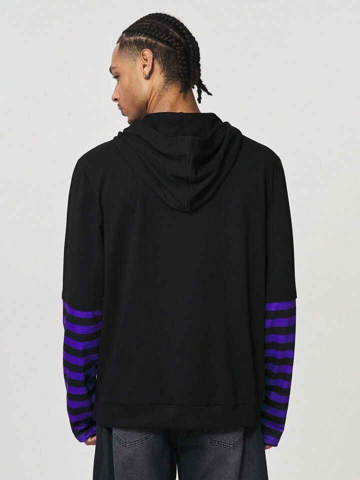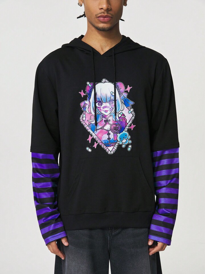 Men's Cartoon Print Contrast Color Hooded Sweatshirt, School