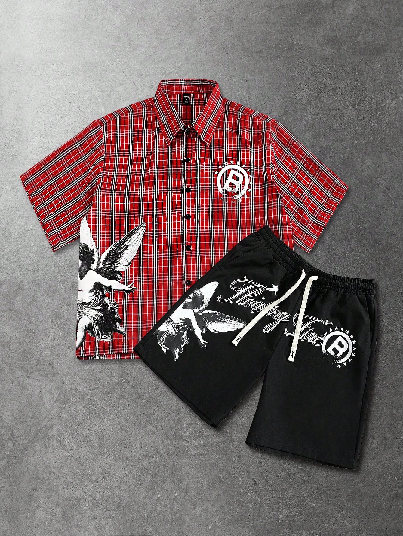 Men's Casual Plaid Angel Child English Print Short Sleeve Shirt Set