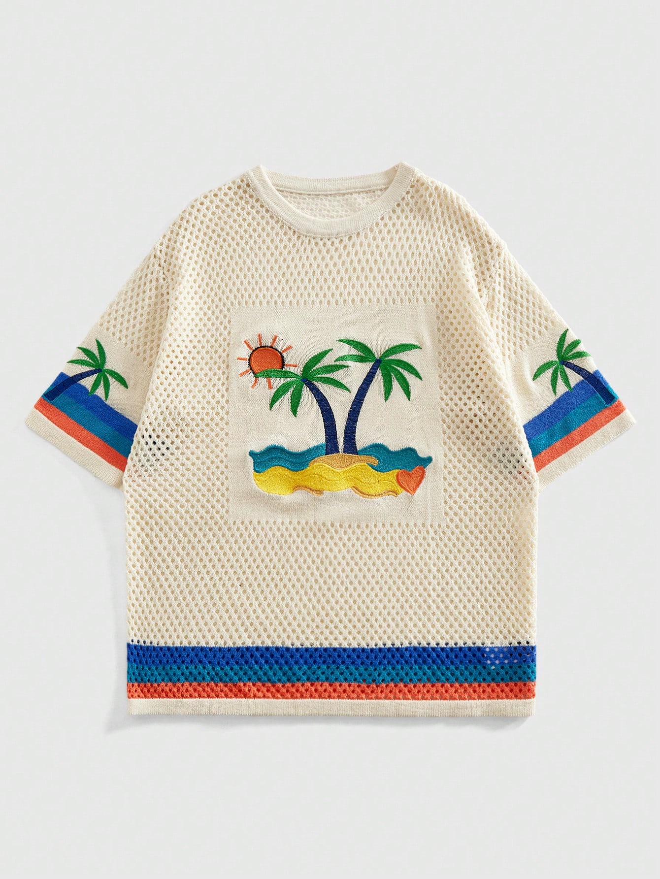 Men's Crew Neck Coconut Tree Embroidered Knit Sweater, Island Vacation