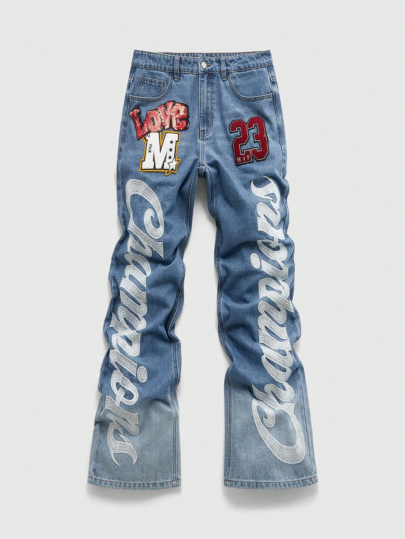 Men's Embroidered Patch Pocket Pleated Casual Denim Jeans