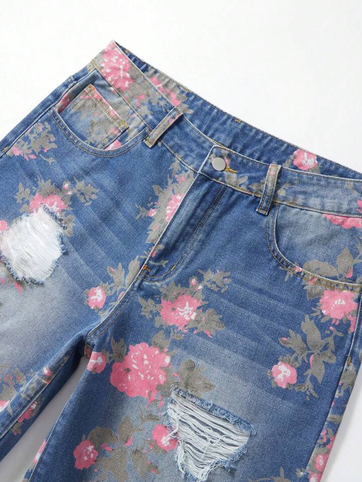 Men's Floral Print Patch Pocket Distressed Loose Casual Denim Shorts, Vacation