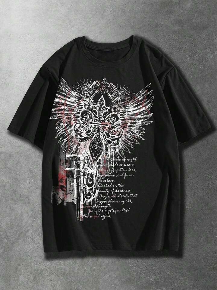 Men's Gothic Cotton Cross & Wing Print T-Shirt