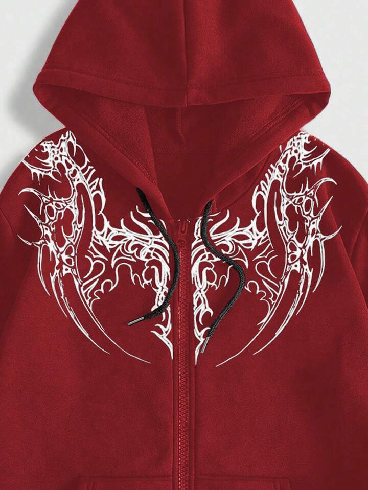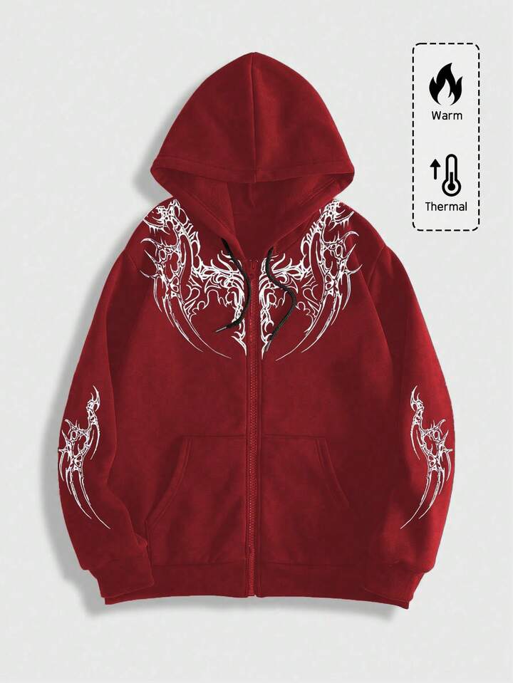 Men's Gothic Fashionable Street Graphic Print Zip-Up Drawstring Hooded Fleece Sweatshirt, Autumn/Winter