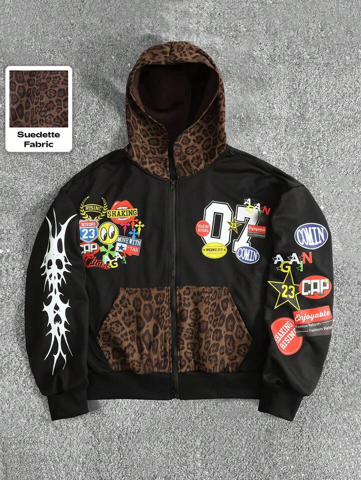 Men's Leopard Print Contrast Color Hoodie, Retro Street Style