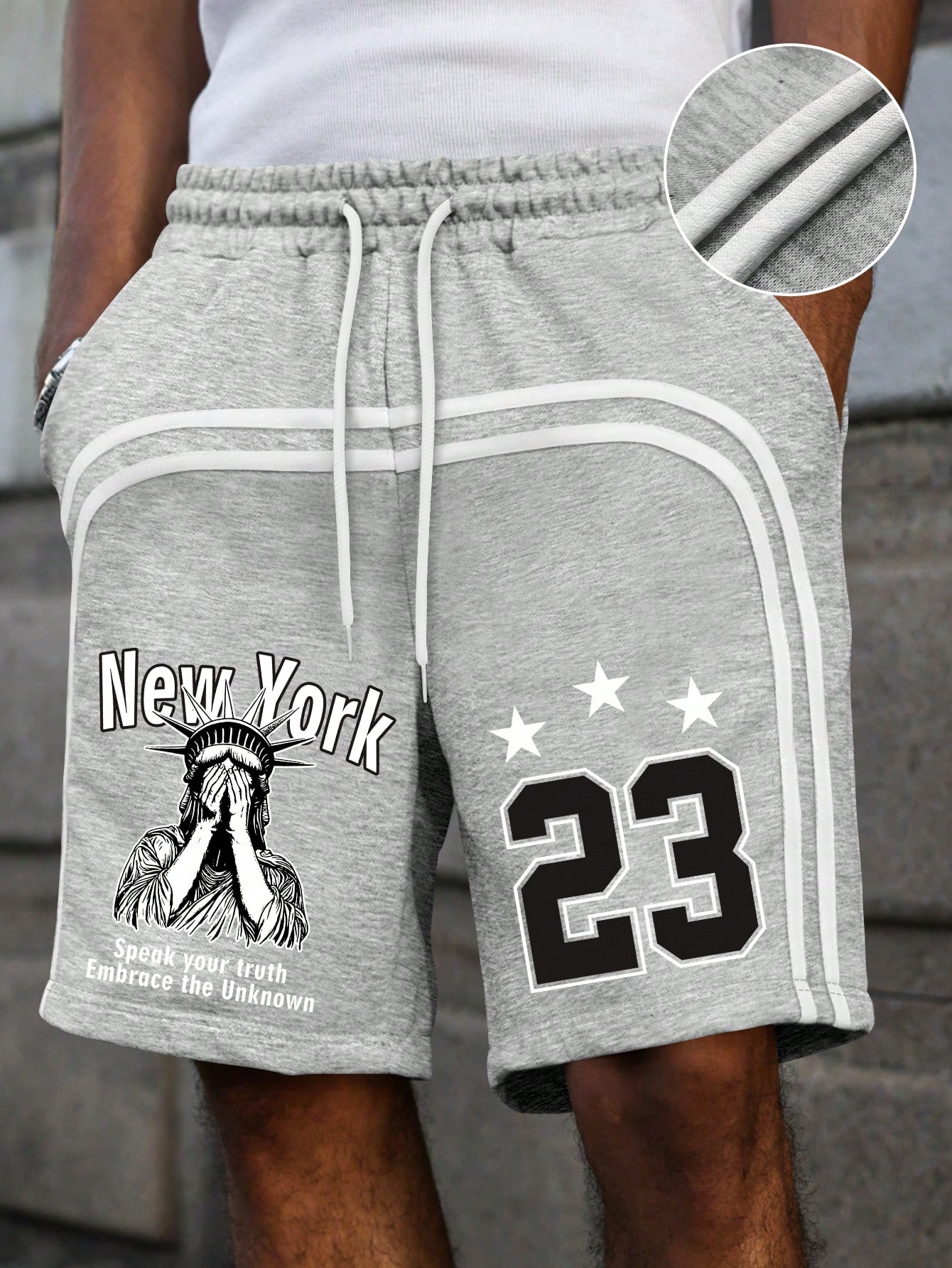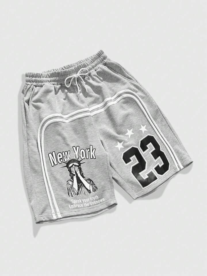 Men's Preppy Drawstring Waist Printed Liberty Statue & Numeric Shorts, Summer Sports Street Fashion