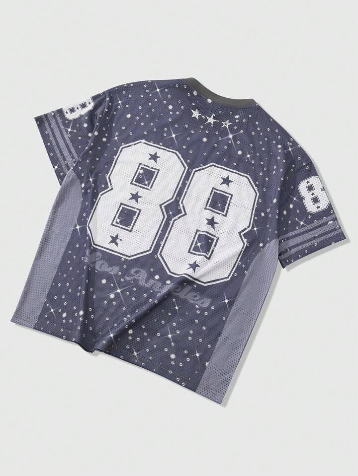Men's Preppy Summer New Stylish Printed Rhinestone Graphic Tee, Streetwear Sports Style, Short Sleeve,