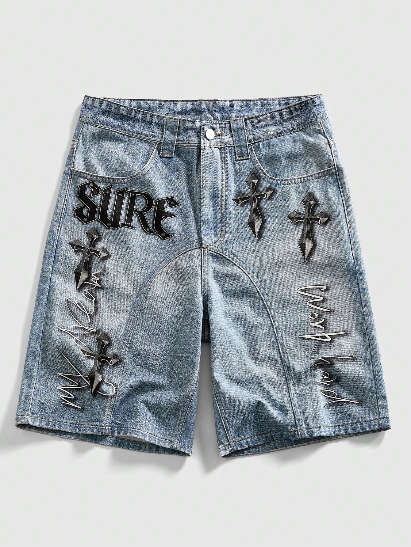 Men's Summer Casual Fashion Street Cross & Letter Digital Print Denim Shorts