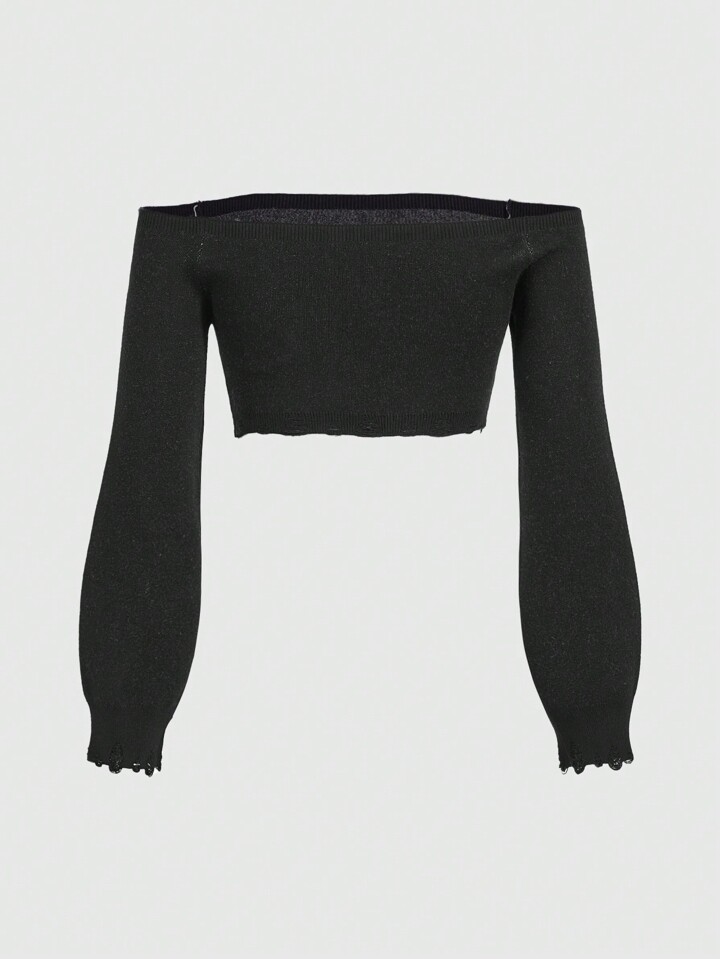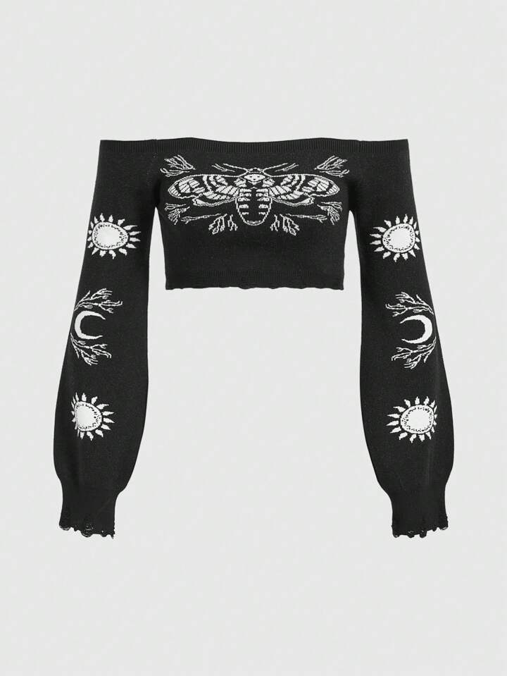 Mystic heart Sun & Moon Graphic Off The Shoulder Lettuce Trim Crop Sweater