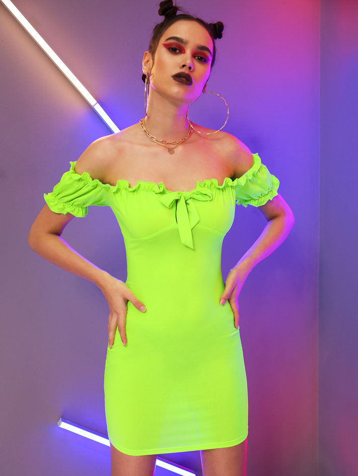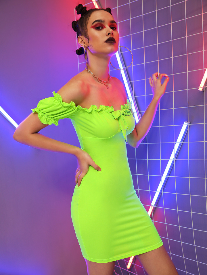 Neon Lime Tie Front Frill Trim Pencil Dress