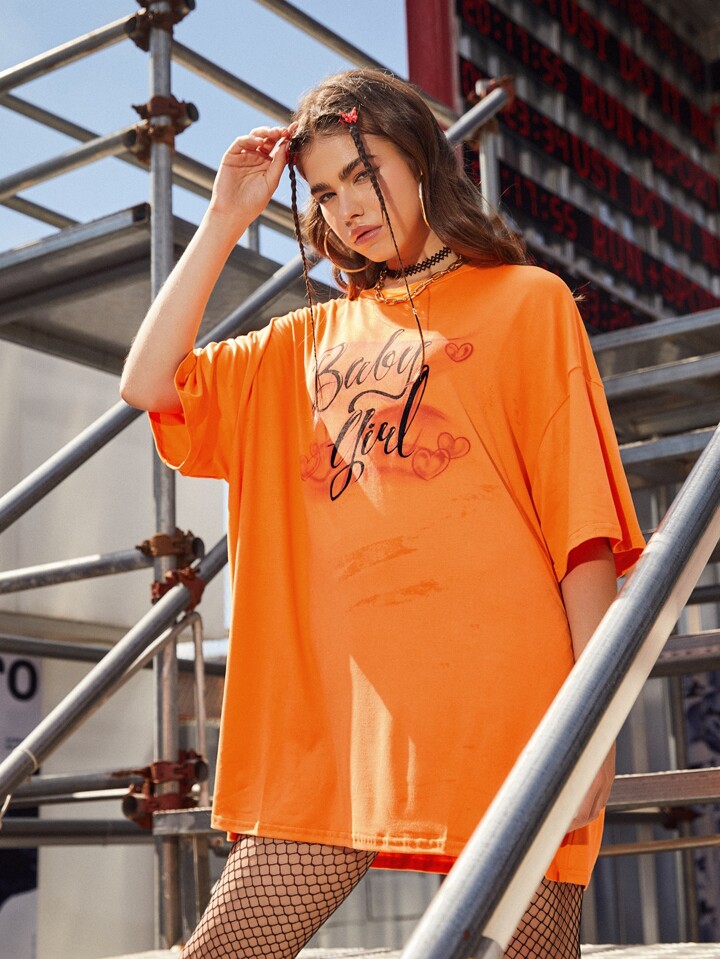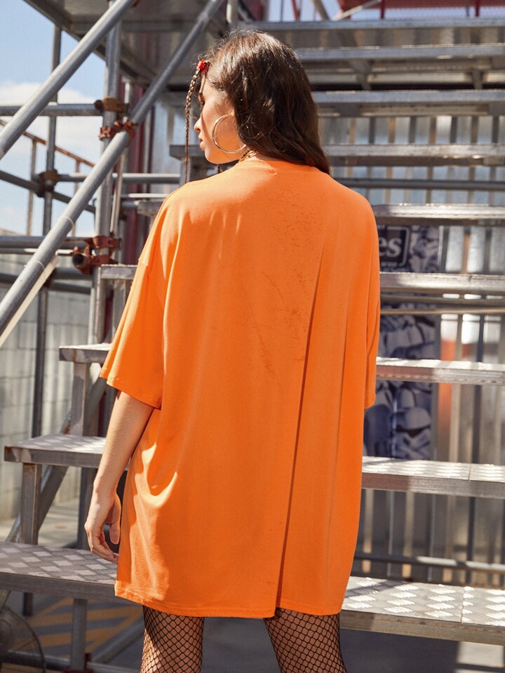 Neon Orange Drop Shoulder Letter & Heart Print Tee Dress