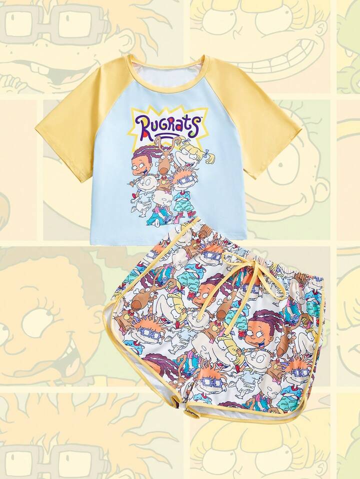 Nick 90's X ROMWE Cartoon Pattern Short Sleeve Top And Shorts Casual Pajama Set