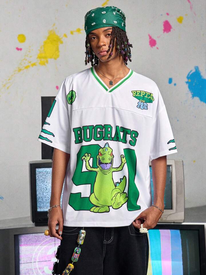 Nick 90's X ROMWE Men's V-Neck Cartoon & Letter Graphic Short Sleeve T-Shirt, Summer