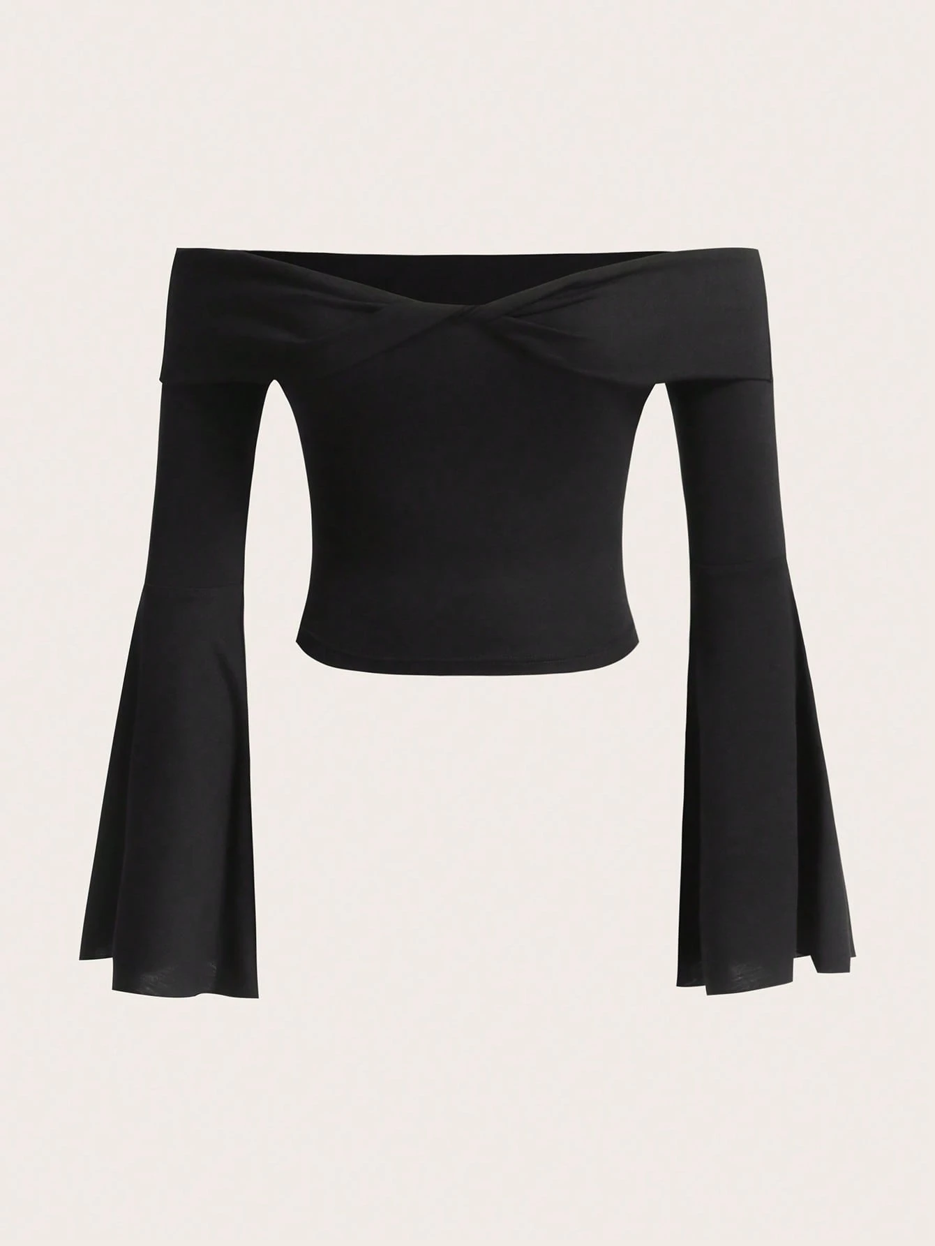 Off Shoulder Bell Sleeve Solid Tee Without Choker